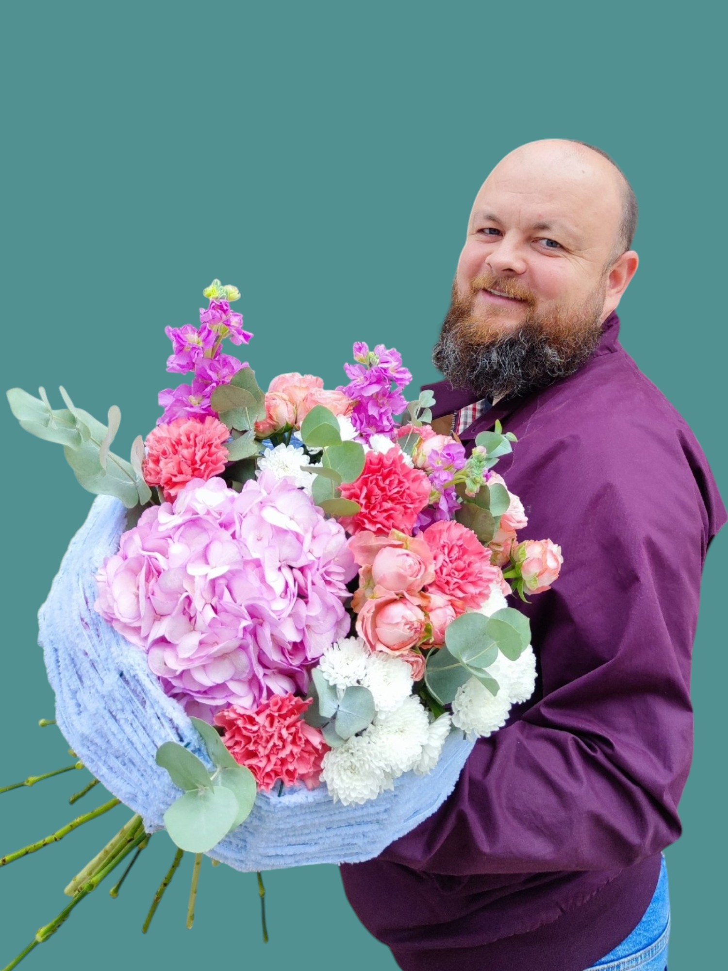 Букет с гортензией, диантусами, мини хризантемами Сантини, веточками эвкалипта, кустовыми розочками и маттиолой, выполнен на авторском каркасе ручной работы